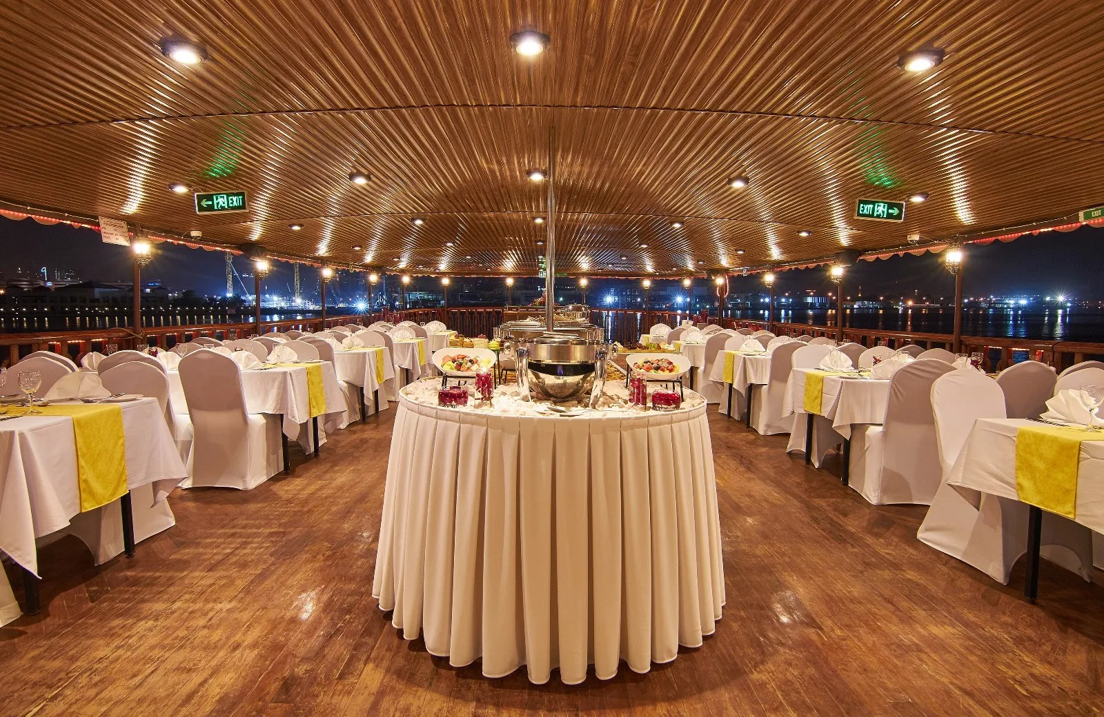 As you step aboard, you’ll be greeted with a welcome drink—a refreshing start to the evening. You can then choose to sit on the air-conditioned lower deck, offering comfort and elegance, or head to the open-air upper deck, where you’ll have unobstructed views of the city’s illuminated skyline.